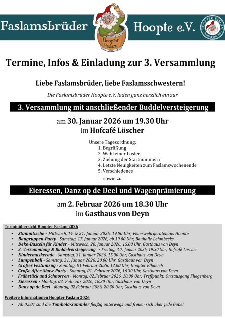 Wer nicht im Landkreis Harburg südlich von Hamburg wohnt, der weiß mit großer Wahrscheinlichkeit nichts mit dem Begriff „Faslam“ anzufangen, denn es handelt sich um einen regional recht begrenzt gepflegten Brauch. Wollte man es in möglichst wenigen Worten erklären, müsste man „sowas wie Karneval auf norddeutsch, nur mit anderen Wurzeln und nicht so spießig“ beschreiben.